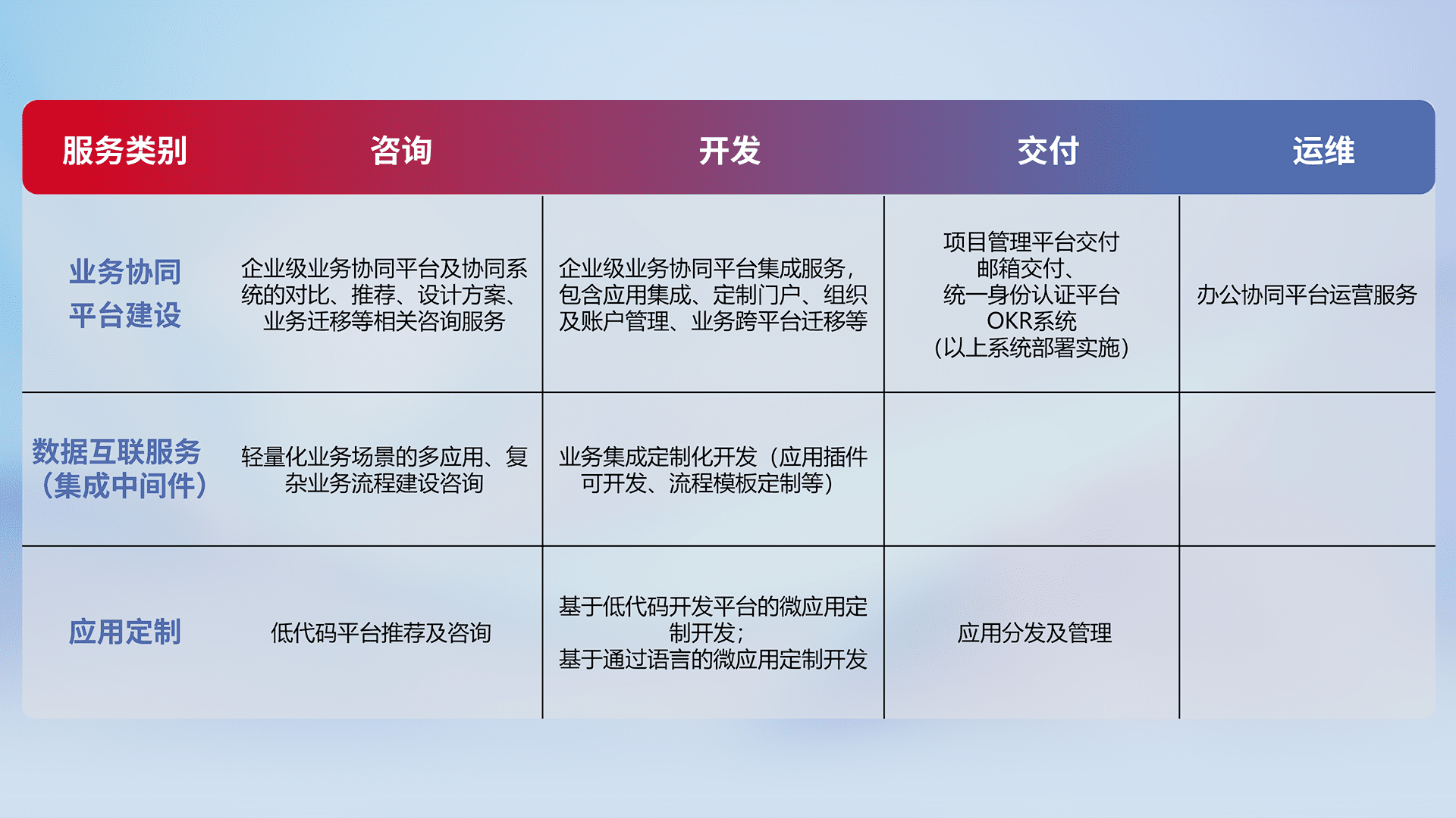 针对钉钉、、、、企微、、、IDaas等平台级产品提供产品的规划、、、方案、、交付、、、、定制化开发等服务,,,,实现如统一协同办公、、智能客户服务、、、混合会议管理、、、智能数据查询、、等业务场景,,,,实现数字化转型。。。。