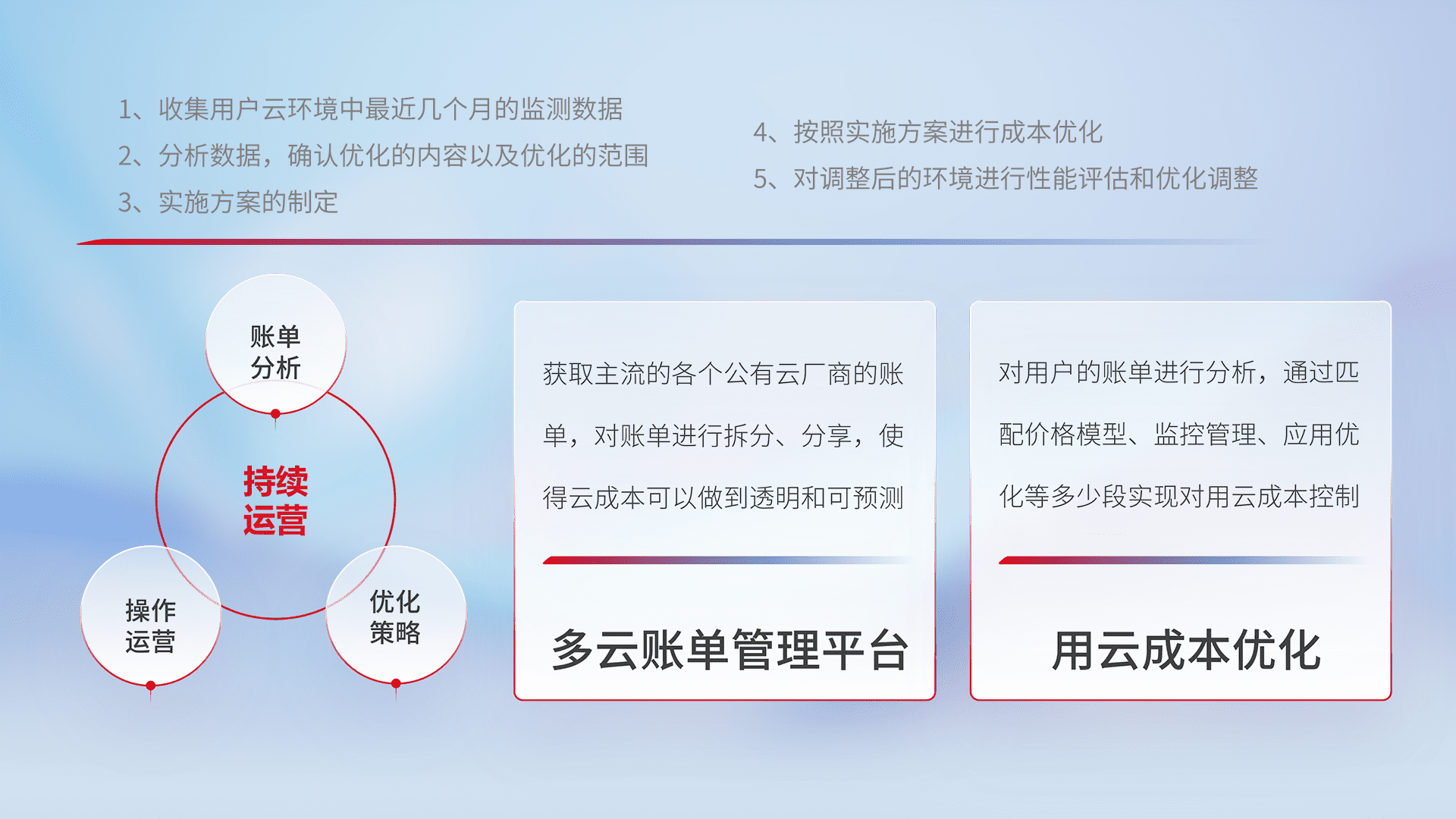 通过多云纳管,,,以统一的资源数据模型把客户的云资源进行抽象和封装,,进而实现对多云资源的统一操作,,保障云资源管理的可靠性、、稳定性与可用性。。。量身定制化运维内容,,,配置、、、开发运维、、、补丁管理、、备份、、、监控、、、、认证和访问管理、、、审计和日常巡检等,,,保障在用云过程中的可靠度,,稳定度以及高可用率。。。